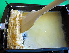 Use the rubber spatula to press the egg mass into shape against the side of the pan. You can also use a small wooden cutting board for the same effect. |