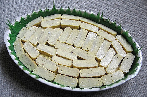 If appearance is less important to you or you just want to try it out without a rectangular pan, you can also use a regular round nonstick frying pan. Inexpensive, slick, relatively new, heavy, nonstick pans perform better with eggs than really high-end pans like All Clad, which are too textured to release eggs easily (tip from Alton Brown’s show on eggs, borne out by my experience). The trick then is to make three thick layers of egg (instead of more) and use a bamboo sushi mat to force the result into shape. The middle will be thicker than the ends because of the shape of the pan, so you can trim the ends after cooling. There’s an illustrated how-to here at JustHungry. |