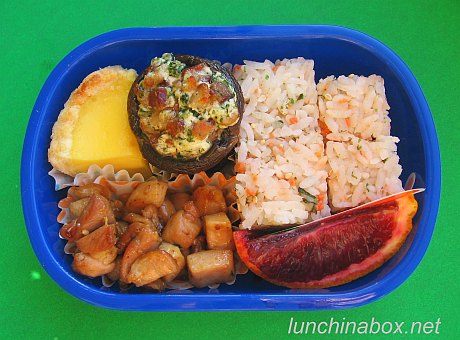 Morning prep time: 20 minutes, using frozen rice and a quarter of a leftover egg custard from a cheap takeout dim sum meal (from Good Luck Dim Sum in San Francisco). In the morning I popped the mushrooms in my convection toaster oven to roast while I microwaved the rice and made the onigiri rice cubes with a little rice cuber (details and how-to here; you can also use a shaped silicone ice cube tray for similar results). The chicken and mushroom filling took the remaining time — I was ambitious for this lunch as I was awake anyway. (Darn Squirrel! At least her brother Moose is chill.) (Click for cooking and packing details, plus an additional preschooler lunch.)