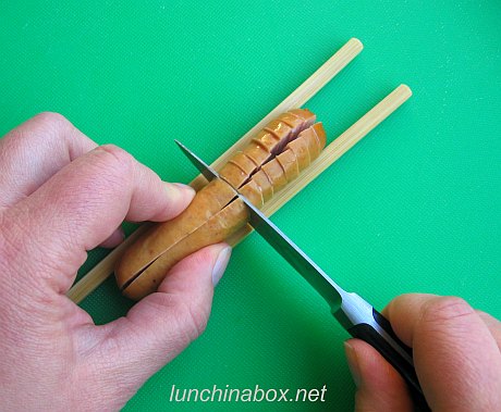 Speed Tip: Put the halved sausage in between two chopsticks on a cutting board, and use a sharp knife to make evenly spaced cuts down the full length of the sausage. The chopsticks keep you from cutting all the way through the sausage, and allow you to cut both of the sausage halves at the same time.